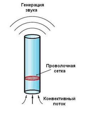 Что же происходит? Оказывается, нагревание металлической сетки в пространстве трубы приводит превращению тепла в звук за счёт к возникновению самовозбуждающейся стоячей волны. То есть это один из примеров акустического резонанса.