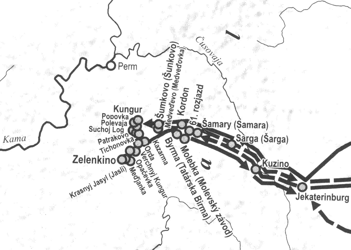 Перед городом большевики уничтожили большой железнодорожный мост через р. Ирень, чтобы мы не могли их догнать. Они слили в снег несколько тысяч гектолитров керосина, перед тем как уйти из города. Граждане собирали снег с керосином и носили его домой в ведрах, ведь его совсем не было в городе. Шаг за шагом мы крались за большевиками. Было утро, совсем темно, мороз 40 градусов. Несколько наших солдат отморозили уши, нос и руки. Наконец, вышло солнце и сразу стало теплее. Мы прошли три версты и вышли из леса на небольшое пространство. Перед нами в двух верстах была маленькая деревня Полевая, которую, как мы позднее узнали, большевики хотели удержать любой ценой. Правая сторона деревни была в лесу. Перед нами была красивая равнина, и снегу было выше колена. Сразу как нас увидели большевики, начали стрелять из пулемета и бросать гранаты. Мы быстро рассоединились и с самой большой скоростью помчались вперед. Когда мы заехали в деревню, большевики сели на сани и убежали. Было минус сорок, мы очень быстро бежали и промокли, как мыши. Деревню захватили за несколько минут. День был очень солнечный. Я был выслан на разведку в две маленькие деревни, чтобы найти большевиков. Было нас восемь солдат и один офицер. Началась паника, и большевики бросили одну пушку, когда они узнали, что наступают чехословаки. Но мы медленно шли за ними, и они успели возвратиться и забрать пушку. В деревне мы были до вечера, позже пришел на смену наш пятый полк.