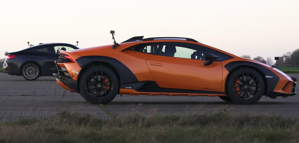Недавно на канале Carwow появился ролик, в котором BMW M4 CS соревнуется с Lamborghini Huracan Sterrato в необычной гонке. Вряд ли для этого можно было найти два настолько непохожих автомобиля. Они представляют собой совершенно разные философии: BMW M4 CS — это спортивный автомобиль, созданный для трека, тогда как Lamborghini Huracan Sterrato — это поднятый раллийный суперкар, предназначенный для бездорожья. BMW M4 CS (G82) оснащён 3.0-литровым рядным шестицилиндровым двигателем с двойным турбонаддувом, который развивает 551 лошадиную силу и 650 Нм крутящего момента. Мощность передаётся через 8-ступенчатую автоматическую коробку передач. Автомобиль весит 1760 кг и оснащён системой полного привода M xDrive, которая обеспечивает отличное сцепление с дорогой. M4 CS также оборудован шинами Michelin Pilot Sport Cup 2 R, предназначенными для обеспечения максимального сцепления на асфальте. Lamborghini Huracan Sterrato, с другой стороны, оснащен 5.2-литровым атмосферным двигателем V10, которы