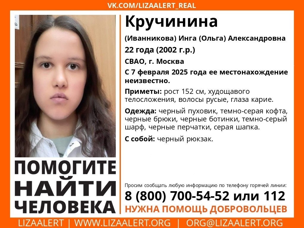В Липецкой области волонтеры присоединились к поискам 22-летней Инги (Ольги) Кручининой (Иванниковой). 10 дней назад, 7 февраля, девушка вышла из дома в северо-восточном административном округе Москвы и не вернулась. — Может находиться на территории Липецкой области, — уточнили в региональном отделении поисково-спасательного отряда «Лиза Алерт». Приметы Инги (Ольги): рост 152 сантиметра, телосложение худощавое, русы волосы и карие глаза. В день исчезновения девушка была одета в черный пуховик, темно-серую кофту, черные брюки, черные ботинки, тесно-серый шарф, черные перчатки и серую шапку. С собой у пропавшей был черный рюкзак. Если вы видели Ингу Кручинину или что-то знаете о ее возможном местонахождении, то сообщите об этом по телефонам — 112 или 8 (800) 700-54-52.