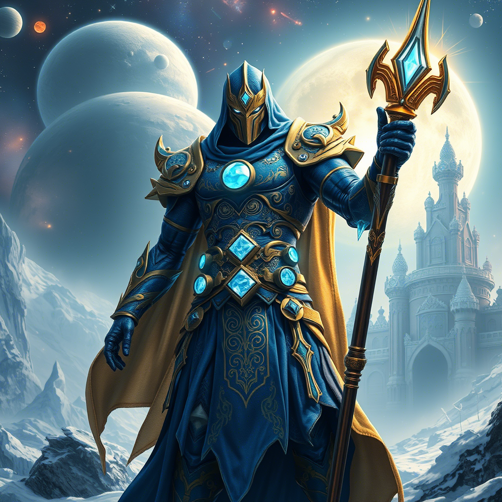 Космос стоял, облаченный в одежду индиго с королевским плащом, который развевался на легком ветру, словно сама вселенная подарила ему этот благородный наряд 🌟👑. Его броня была украшена мягкими узорами, расположенными на карте созвездий, а каждый элемент переливался отблесками серебра и голубого света, казавшихся шепчущими тайнами давно утраченных миров ✨🌌. В его руке находился посох Созвездных Кристаллов 🪄💙 — древний артефакт, чья вершина была инкрустирована мягким светящимся синим кристаллаом. Онпульсировали энергией, создавая вокруг него электрические разряды 🔦⚡, которые переплетались в причудливые узоры, сопровождающие танец звезд ✨💫. Посох был больше, чем оружие — это был символ его связи с бесконечным космосом.. За его спиной простирался фантастический образ: заснеженные горы 🏔️❄️, древний замок ⛤️✨, а над ними парили огромные луны, окрашенные в оттенки серебра и голубого цвета 🌕💧. Звездное небо было усыпано бесчисленными светящимися точками, которые мягко мерцали, явля