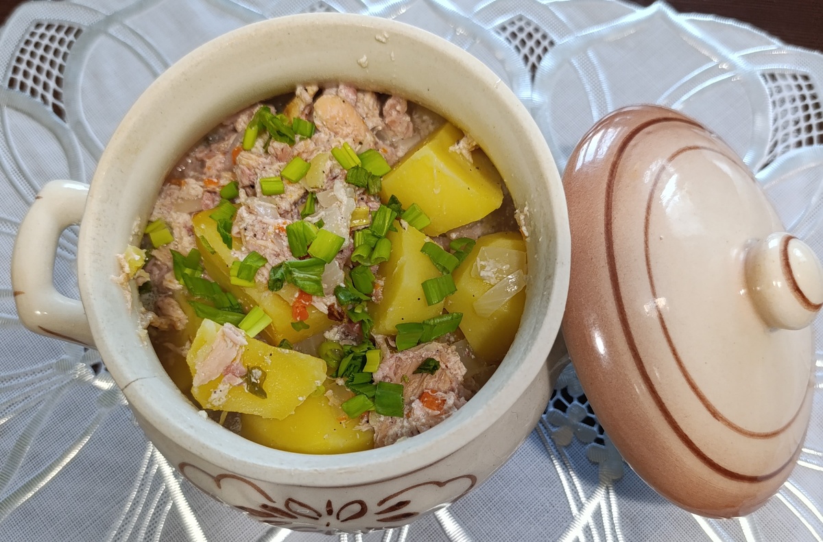 Обожаю этот рецепт - легко готовить, минимальное количество продуктов, а результат превосходит все ожидания!!!! Блюдо получается томленым как из печи! Ингредиенты: филе куриное - 1кг картофель - 1 кг морковь - 1шт лук - 1 шт сметана - 100 гр соль, зелень, лавровый лист, перец - по вкусу Куриное филе нарезаем кубиком, картофель очищаем и нарезаем кусочками произвольно, морковь можно полукольцами нарезать, можно кубиком, лук нарезаем полукольцами. Все смешиваем, добавляем сметану, солим, перчим или добавляем другие ваши любимые специи. Раскладываем по горшочкам, добавляем в каждый горшочек 50 гр воды. Ставим в духовку на 1 час при температуре 170 градусов. Готовое жаркое посыпаем зеленью и можно подавать: в горшочке, или выложить на тарелку. Приятного аппетита!!!!
