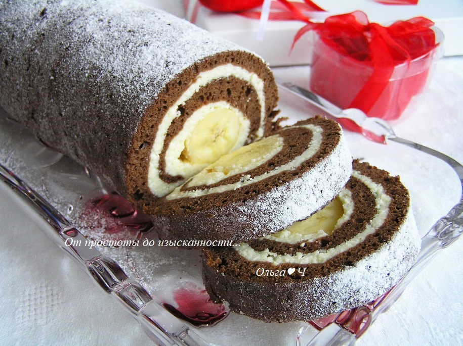 Всем доброго воскресного дня! Перед вами один из вариантов рулета, который печется вместе с начинкой и не нужно отдельно готовить крем. В дополнение - банан или любые другие фрукты. Рулет получается очень нежным и вкусным. Попробуйте! Ингредиенты: Для теста: