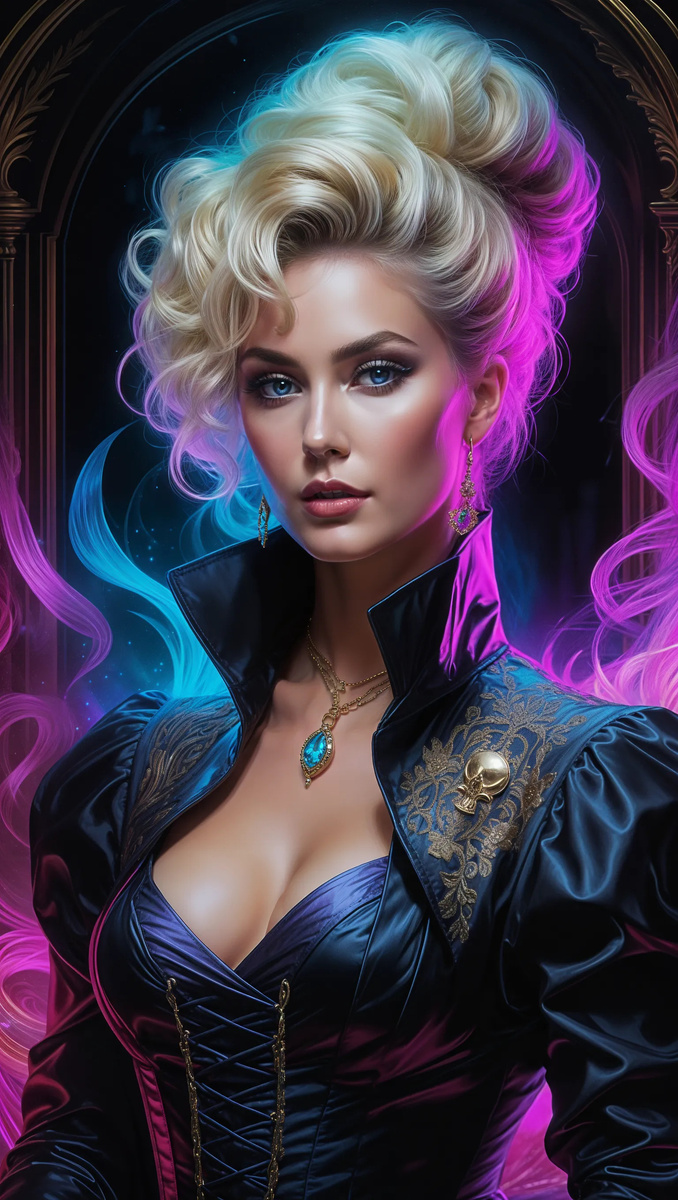Неоновое фэнтези, Оккультное искусство, Роскошный и эклектичный портрет в стиле Artgerm, встречается с Питером Паулем Рубенсом. Портрет в полный рост. Это темная фантазия, запечатленная тонким декором черепа и эстетикой с фантазийными неоновыми бликами, фоном из мягких масел и четкими линиями, обрамляющим объект - голографически окрашенная блондинка, сложная прическа, воплощенная в стиле пин-ап Питера Келли и ведьминской эстетике, переплетенная с яркими частотами паровой волны, смелыми цветами космического поп-арта, техникой цветных карандашей, потрясающими гиперреалистичными деталями, объемным освещением, цифровой живописью Эти нейроарты созданы мною в нейросети Playgroundai. _________________________________________________ P.S. Приглашение на Мастер-Классы по изучению Топовых Нейросетей, где Вас ждут Бонусы и Подарки: <<<Участвовать Бесплатно>>>