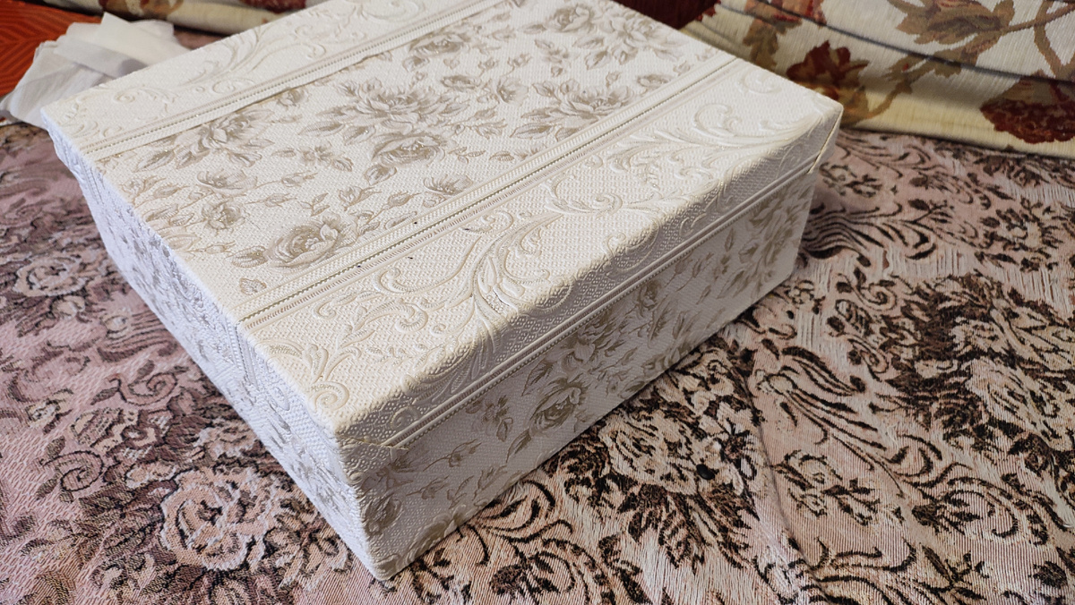 Коробка обклеена моющимися обоями с красивым рисунком.