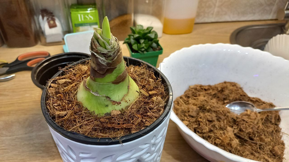 Среди дюжины откровенных мертвецов нашла одну с проклёвывающимися из черной шелухи бледными листьями. Сцапала, разумеется. Почистила от шелухи, вырезала места с красной гнилью, убрала подсохшие корешки. И усадила в горшок. Внизу грунт для луковичных, смешанный с кокосовым субстратом. Сверху слой кокоса, чтобы проще было контролировать влажность. Это сорт "Клоун", но на самом деле не факт. Там, где люди могут свободно брать луковички, разглядывать и класть обратно, может случиться любая пересортица. И раз уж, достала грунты и горшки, решила разбудить\пересадить купленный в прошлом году "амариллис" "Аляска".