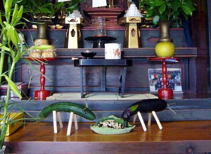 Обычно в середине августа у нас на грядках поспевают огурчики и баклажаны. В Японии тоже. И если бы вы в это время зашли в гости к японцу, то увидели бы на столе довольно странную парочку этих овощей — с приделанными деревянными ножками. Всё дело в том, что с 13 по 15 августа в Японии проходят дни Поминовения усопших, праздник О-Бон (お盆). Считается, что в эти дни души ушедших предков из мира мертвых возвращаются навестить своих родных в мире живых. Казалось бы, грустно… Но японцы радуются этой встрече! Для духов предков украшают домашние алтари, оставляют подношения в храмах, и чтобы духу проще было найти дорогу домой, у входа в дом зажигают фонарик. Возвращаясь к овощам: как вы уже догадались, они не просто так… Они тоже отражают заботу об удобстве духов: огурец символизирует лошадь, на которой душа усопшего родственника вернётся домой, а баклажан — корову, на которой не спеша дух вернётся обратно, в мир мертвых. Праздник негосударственный, но многие компании закрываются на эти дни,