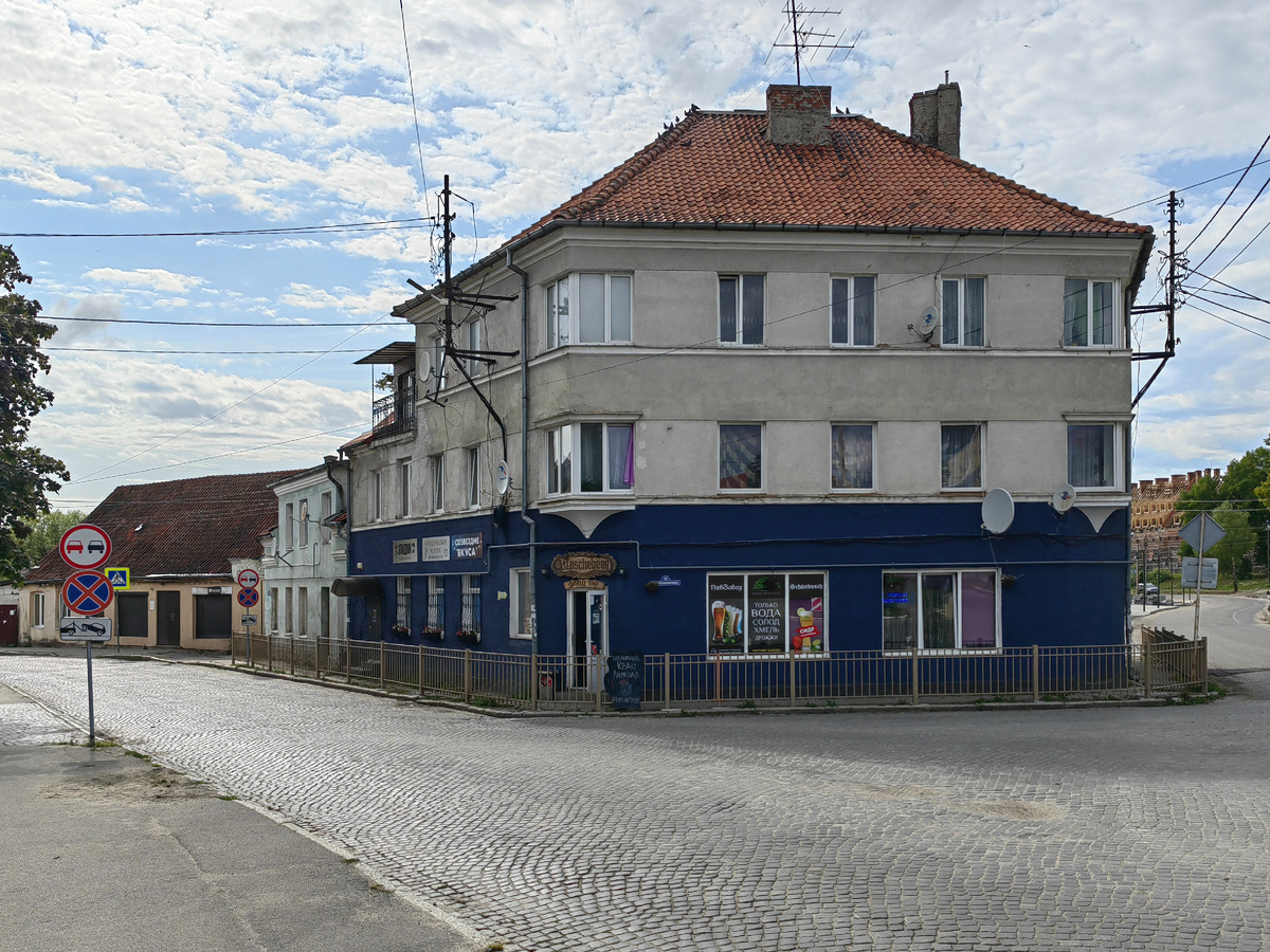 Потому что на его фасаде (сбоку дома) сохранился любопытный артефакт. Интернет говорит, что это реклама строительного бизнеса братьев Харвардт. В Прейсиш Эйлау у братьев был завод (Baugeschäft und Dampfsägewerk, Gebr. Harwardt, Werksgelände), в котором были: паровая лесопилка, столярное и мебельное производство, производство стройматериалов, цементный завод. Здание завода сохранилось и по сей день, но я его не видел.