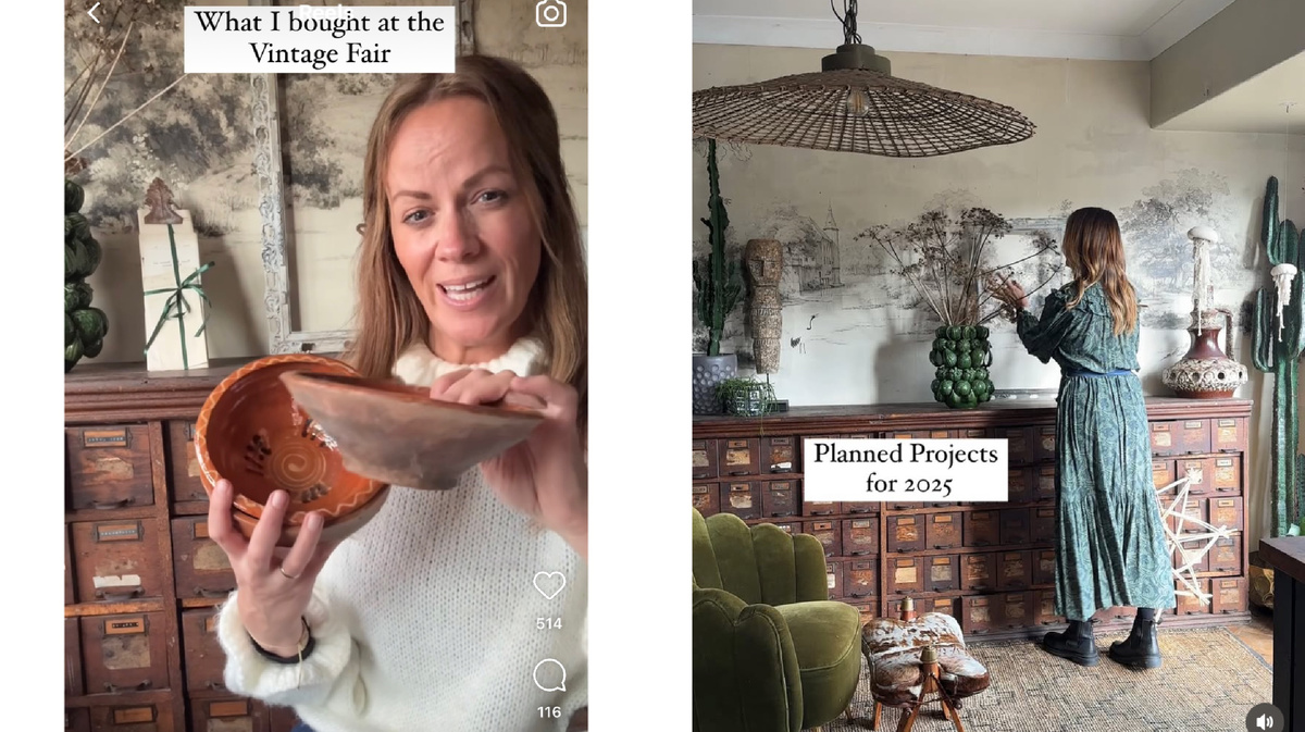 Шерилл любит находить старую посуду, вазы и даже мебель на блошиных рынках и в винтажных магазинах. Обратите внимание на фотографию слева, она показывала винтажные керамические тарелочки, а справа на комоде стоит керамическая ваза (находка на блошином рынке)