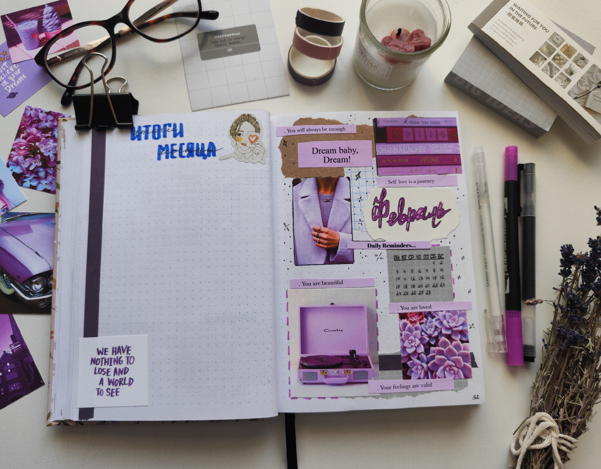 Февраль хоть и короткий месяц, но выдался очень разнообразным во всех смыслах. Поэтому и его оформление показываю в первый день весны! 😁 Да и внешний вид его, тоже стал немного нестандартным для меня. Выбор цветовой гаммы месяца выпал на фиолетовый цвет, да и захотелось уйти от стандартной зимней тематике на что-то нейтральное. Основной разворот Календарь на месяц Задачи и недельный разворот Решила в этом месяце попробовать такой формат недельных разворотов. Небольшое разнообразие внесла ещё с добавлением фаз Луны и отметками о настроении. На последней страничке планирую подводить своеобразные итоги месяца, где отмечаю важные и памятные события, а так же то что я сделала в этом месяце конкретно для себя. Ну и подвести краткие итоги зимы, что было хорошего и не очень. Желаю всем приятного и продуктивного планирования! 📖✏️☕