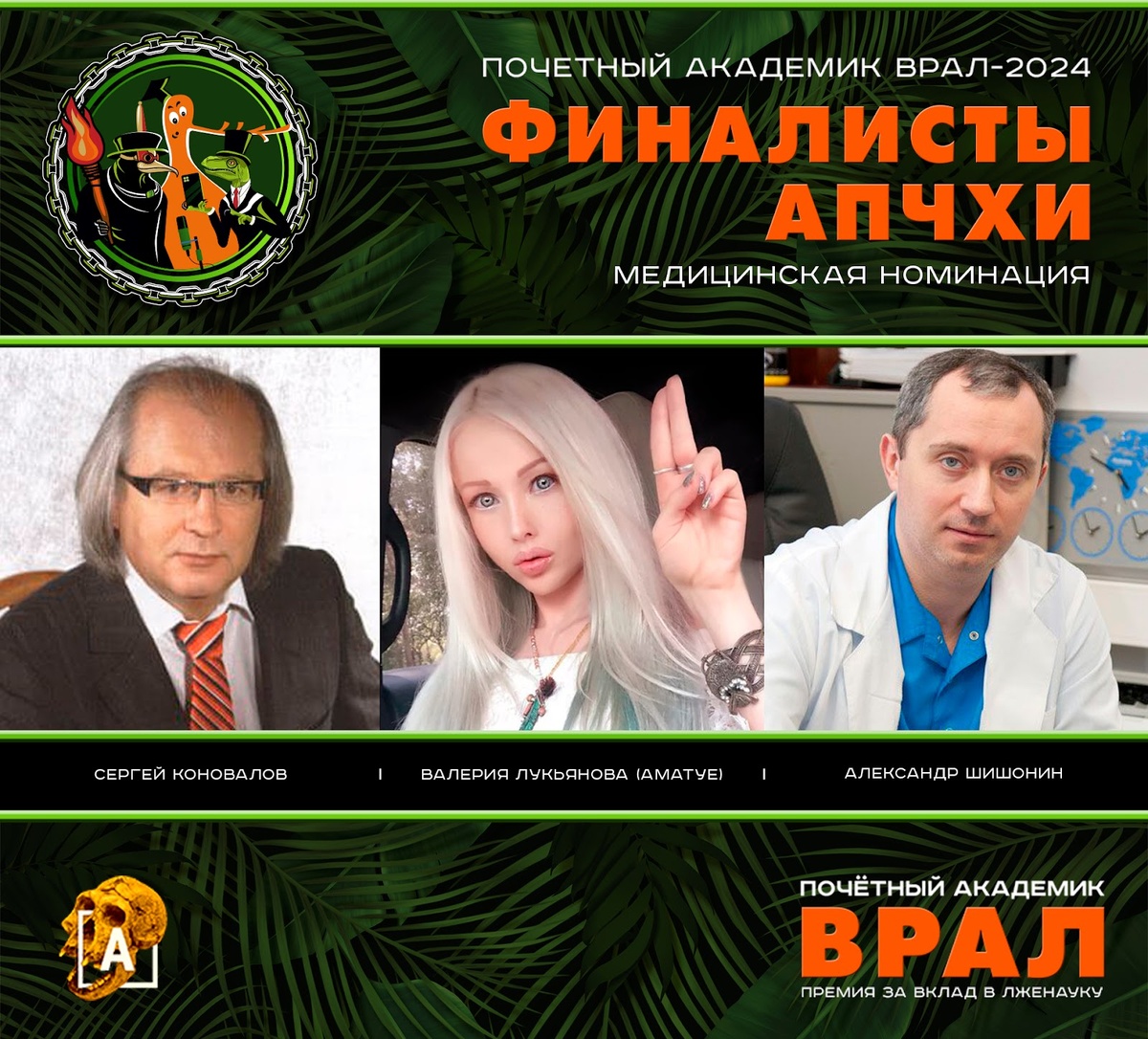 3 февраля завершился полуфинал премии Почетный Академик ВРАЛ и были объявлены имена тех, кто достоин войти в высшую лигу лженауки. Напомним, что в 2024 году премия вручается в двух номинациях: медицинской «АПЧХИ» и сетевой «ОБЛВАН». Представляем лидеров предвыборной гонки!
