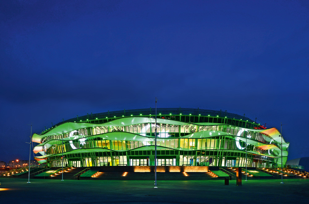 Когда проезжаешь мимо гимнастической арены со стороны проспекта Гейдара Алиева, крепкий прямоугольный тренировочный и хозяйственный блок скрыт от праздного взгляда, видно лишь полукружие основного манежа – стеклянный фасад, увитый металлическими лентами. Ленты – предмет отдельной гордости архитекторов, известной британской компании Broadway Malyan. Они не только членят этажи здания, разрушают скуку симметрии, но и создают ощущение невесомости конструкции. В свете солнца металлические изгибы мерцают: кажется, что гимнастические ленты колышутся и здание способно оторваться от земли и полететь.