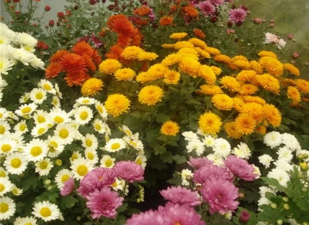 Хризантемы считаются самыми не притязательными растениями в плане соседства и прекрасно уживутся на участке с большинством декоративных культур, так же как и они предпочитающие солнечные участки. Хорошую композицию им составят шалфей, колеус, очитки, садовые злаки. На их фоне цветение хризантемы будет казаться ещё более ярким. Из красивоцветущих растений, в компанию к хризантемам в ярусную клумбу можно посадить как однолетники, так и многолетники: дицентру, маргаритки, монарду, астры, бархатцы, георгины, львиный зев, дельфиниум, рудбекию, ромашку, календулу, циннии. Период цветения у них может не совсем совпадать, но в плане совместимости на одной клумбе они вполне подходят, к тому же нам нужно разновременно цветущая клумба. Сами по себе прекрасно будут смотреться моноклумбы с разноцветными разносортовыми хризантемами – разнообразие форм и оттенков у этого растения предостаточное, есть из чего выбрать. Однолетние хризантемы отлично смотрятся в кашпо. Как и самодостаточные розы и пи