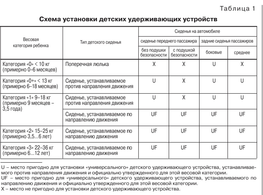 УСТАНОВКА ДЕТСКИХ УДЕРЖИВАЮЩИХ УСТРОЙСТВ На Вашем автомобиле для крепления детских удерживающих устройств используются штатные ремни безопасности для взрослых пассажиров. Безопасное размещение детей в автомобиле возможно только при использовании детских удерживающих устройств, соответствующих требованиям Европейского стандарта ECE R 44. При выборе детской удерживающей системы необходимо руководствоваться информацией, приведенной в таблице 1 «Схема установки детских удерживающих устройств». Установка и эксплуатация детского удерживающего устройства должны осуществляться в соответствии с инструкцией изготовителя детского удерживающего устройства. Предупреждение 1. Запрещается использовать на правом переднем сиденье, защищенном активной подушкой безопасности, детское удерживающее устройство, в котором ребенок сидит лицом против хода движения. 2. Запрещается держать ребенка на коленях во время движения автомобиля. 3. Наиболее безопасно перевозить детей в возрасте до 12 лет на заднем си