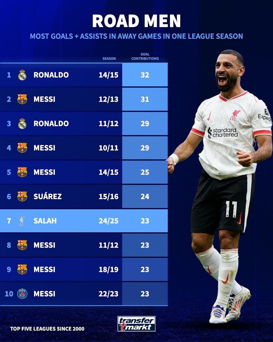 Мохамед Салах набрал потрясающую форму: у египтянина 47 (28+19) очков в 36-ти матчах сезона за «Ливерпуль» во всех турнирах. В игре с «Вулверхэмптоном» фараон забил победный гол с одиннадцатиметровой отметки – для Салаха это 32-й реализованный пенальти в АПЛ, больше только у Ширера, Лэмпарда и Кейна. Результаты Мо в выездных матчах лиги тоже впечатляют: 23 результативных действия в 13-ти матчах вдали от «Энфилда». Transfermark вспомнил лучшие сезоны игроков из топ-5 лиг по их результатам на выезде. Первое место занял Криштиану Роналду в сезоне-2014/15, когда португалец сделал 32 результативных действия в Ла Лиге вне стен «Сантьяго Бернабеу». Лионель Месси в сезоне-2012/13 подобрался близко к оппоненту: 31 голевое действие на выезде. Аргентинец занял сразу шесть позиций в рейтинге, зато у Криро два попадания в топ-3. Гегемонию Лео и Криша прервали двое – Луис Суарес в сезоне-2015/16 и Мо Салах в текущей кампании. Рекордсмены топ-5 лиг по результативным действиям в чемпионате на выезде з