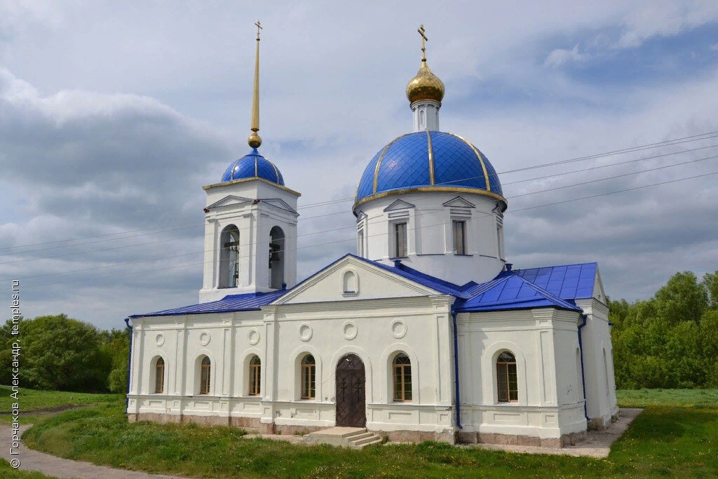 Описание строений: "Тихвинская церковь - каменная, на каменном фундаменте, снаружи отштукатурена, внутри отштукатурена и покрыта масляной краской, покрыта железом, окрашенным зеленою масляной краскою. Длина церкви, считая и колокольню 11,5 саж., ширина - 6 саж.