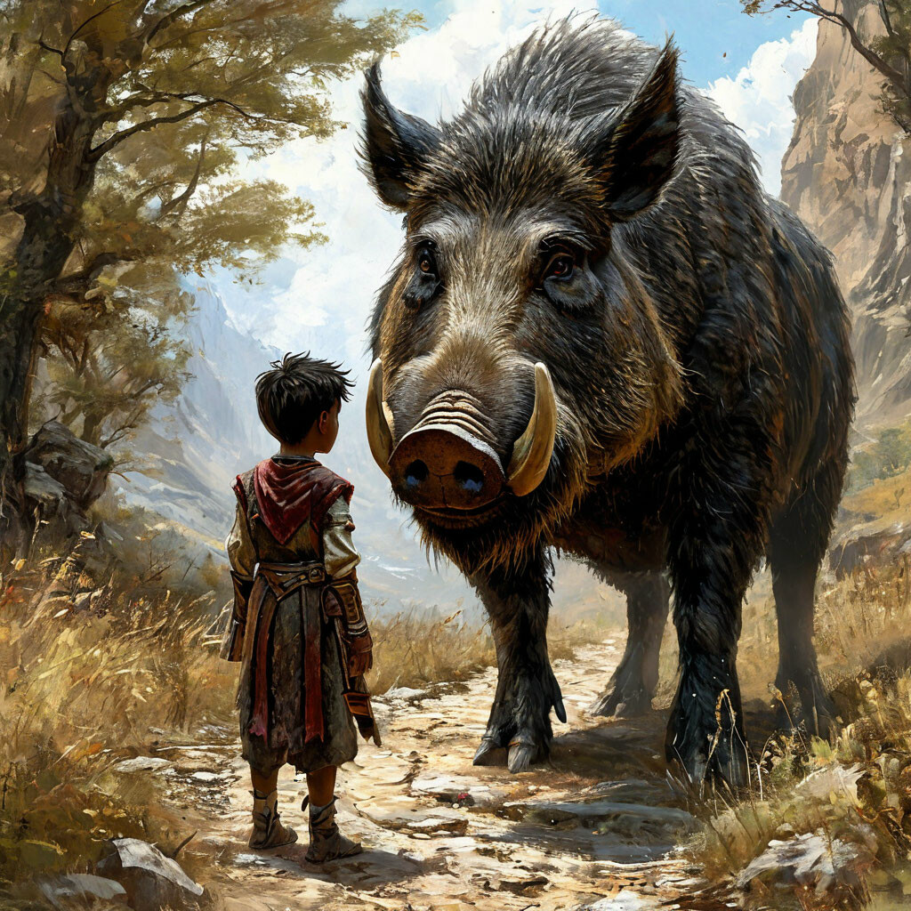 Послышалось легкое шуршание, а потом и топот. На тропе показался огромный секач, ведущий к водопою нескольких самок и детенышей. Огромные клыки были похожи на кривые кинжалы, серая с проседью шерсть, злобные глазки недоверчиво осматривали все, что попадалось на пути. Когда до кабана оставалось всего пара саженей, Италлон вышел и перегородил тропу. Кабан среагировал мгновенно, издал короткий хрюк, подавая сигнал об опасности своему стаду, а после метнулся в сторону беса.