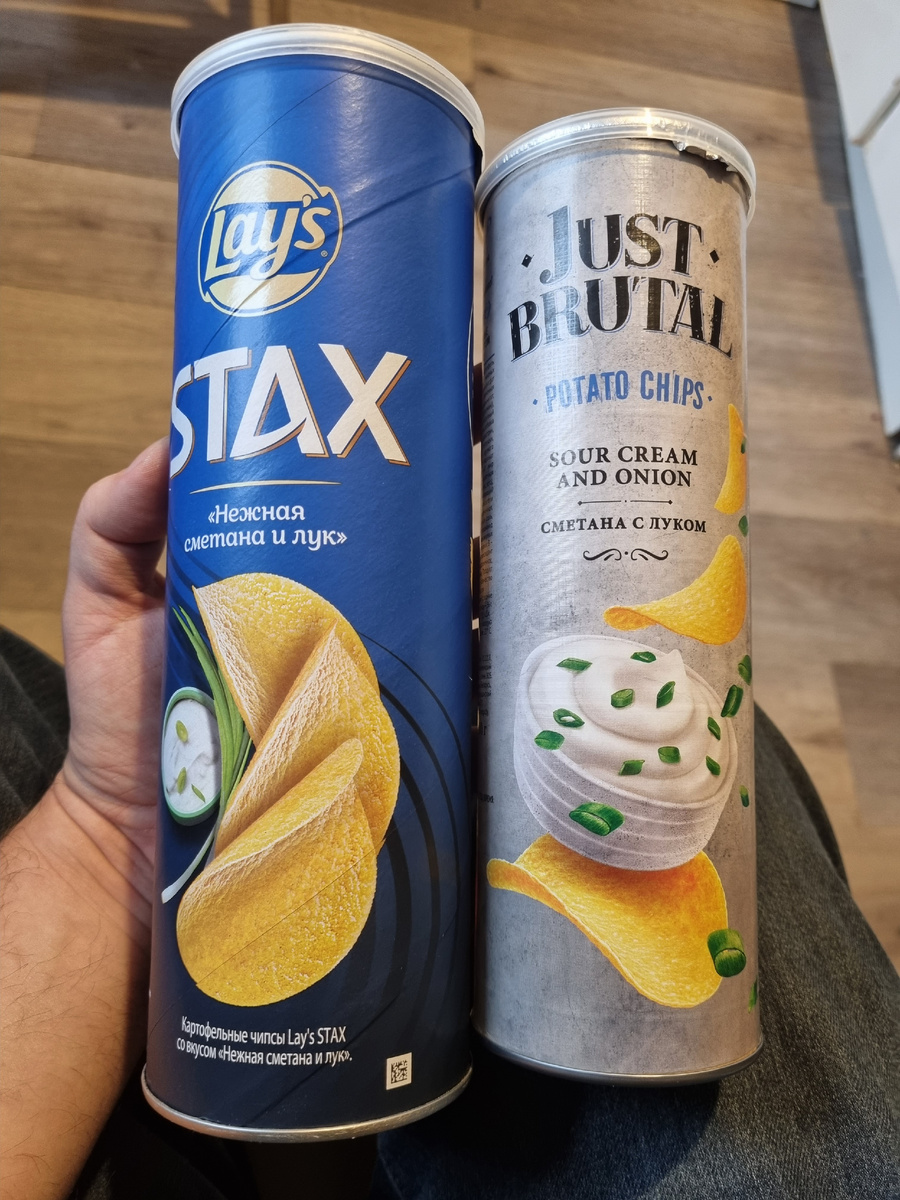 Сегодня у нас выпуск про чипсы. Несмотря на то, что из России официально ушли чипсы Принглс, и теперь они продаются с совершенно неприличным ценником, некоторые производители сразу заняли эту нишу. Вот и сегодня у нас 2 вида подобных чипсов: Оба варианта со вкусом сметаны и зеленого лука. Оба куплены в Чижике. Just Brutal из Белоруссии с ценником 149р за 100 грамм или 1490р за кило. И Lays Stax по 189р за 140гр. 189 рублей!!!! За чипсы! Но с другой стороны это 1350р за кило, что дешевле белорусского аналога. Если кому интересно -можете смотреть состав. Нам и так понятно что это не самая полезная еда и мы лезем открывать банку и пробовать. Первым пробуем Just Brutal: Чипсины относительно толстые, пересыпаны какой-то зеленушкой, выглядит красиво. Картофельный вкус на уровне растворимого пюре. Да, здесь чувствуется вкус растворимого пюре. Впрочем, ничего плохого в этом нет. А вот с чем хуже -так это с солью. На мой ваус они слишком соленые. А это у нас Lays. Тут все более стандартно. Чип