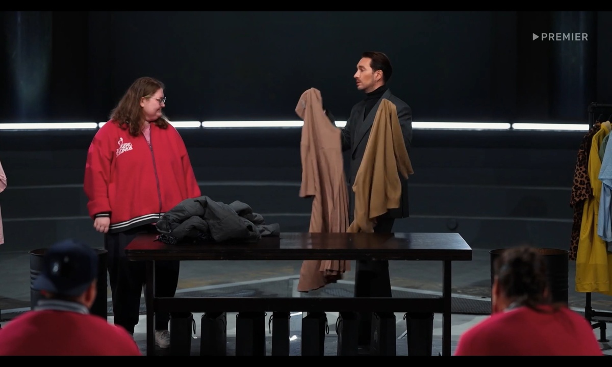 На подиуме Маша, самая большая девушка проекта по весу. Она неожидала увидеть себя в таком образе, непривычная длина платья, ей бы короче по душе, еще и цвет темный, хотя она предпочитает яркие. А вот мужу Маши всё понравилось, он наоборот считает, такая длина ей подходит больше чем короткое, да и к цвету претензий нет.