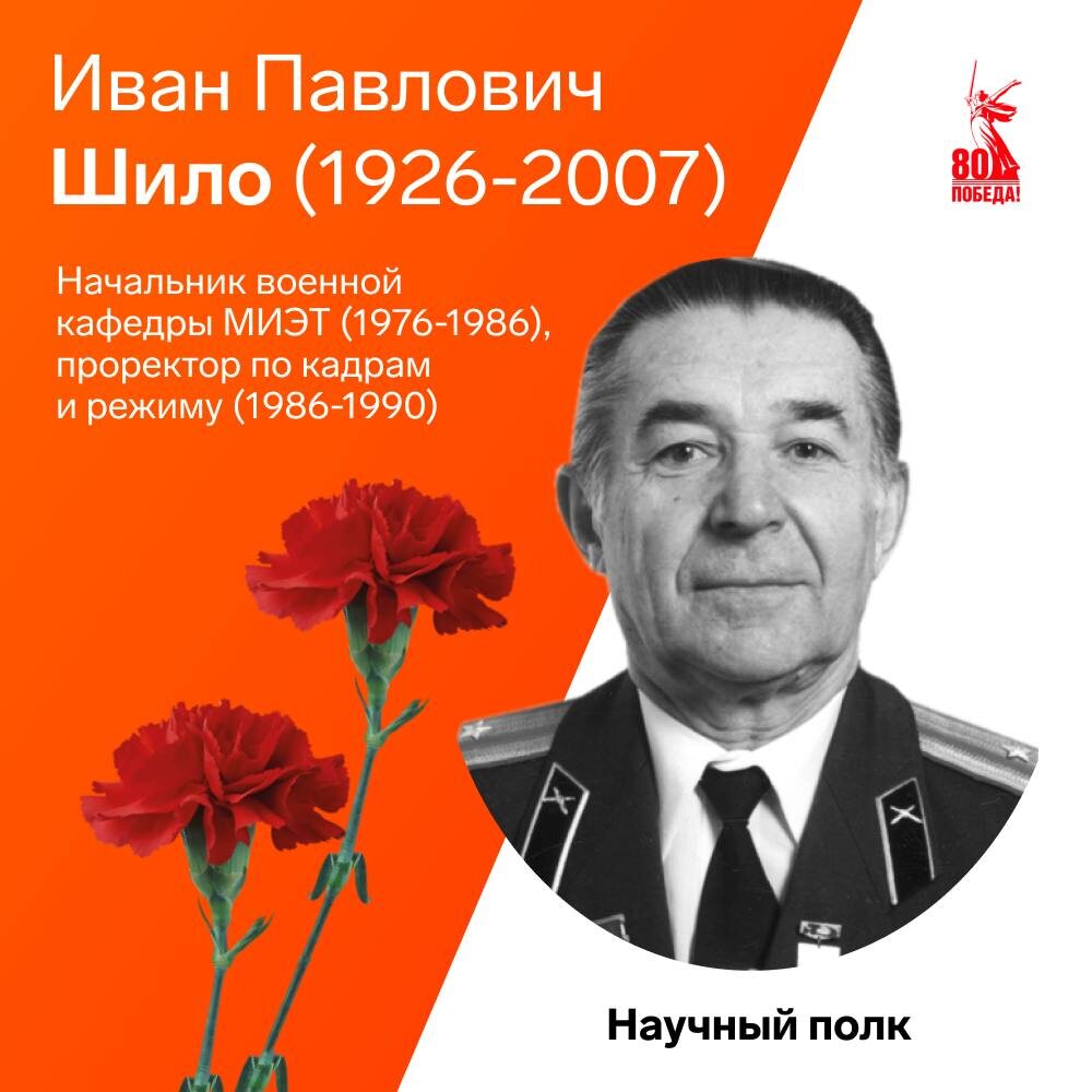 В рамках рубрики #НаучныйПолк сегодня мы хотим вспомнить про заслуженного работника МИЭТа, полковника Ивана Павловича Шило (1926-2007) — участника Великой Отечественной войны и боевых действий на Ближнем Востоке, награждённого 3 орденами и 20 медалями, в том числе двумя орденами Красной Звезды и орденом Отечественной войны II ст. В 16 лет после принятия присяги он был направлен вместе со своими друзьями в 359-й отдельный зенитно-артиллерийский дивизион малого калибра. Вскоре, освоив 37-миллиметровую пушку, Иван Шило был назначен командиром орудия - самым молодым во всём дивизионе. С 1976 по 1986 год Иван Павлович руководил военной кафедрой МИЭТ, с 1986 по 1990 год был проректором по кадрам и режиму, позже возглавлял спецотдел университета. С первых дней создания МИЭТа, начиная с 1966 года, среди профессорско-преподавательского состава было много участников Великой Отечественной войны. Среди них помимо И.П. Шило были заведующие кафедрами: В.И. Мурыгин, А.В. Ефимов, Ю.Д. Чистяков и Е.К.