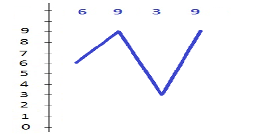 И тогда просто интересно было бы бросить взор на число 6939, на его теоретически весьма интересную графическую интерпретацию. Для начала мы просто нарисуем вертикальную числовую ось, нанесем на нее цифры от 0 до 9, а затем справа от нее отразим последовательно все цифры, входящие в это число, на одинаковом расстоянии друг от друга (рис. 1). Нечто подобное делалось и в «О разгадке тайн летосчисления от основания города (AUC)… » ([3]) для числовой последовательности строительства пражского Карлова моста 975313579, связанной с тройным метоновым циклом (19*3 = 57)