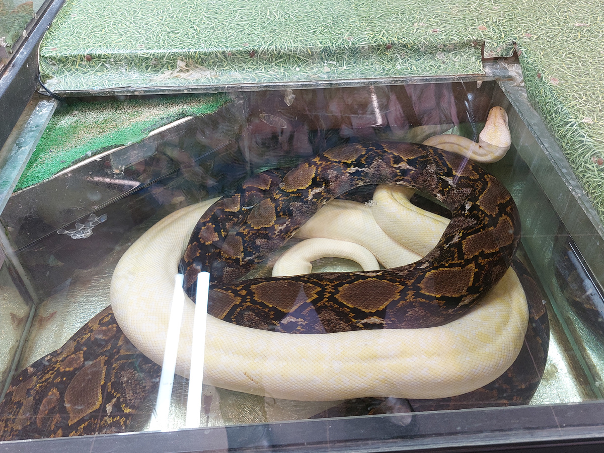 Кто змей любит, для них это конечно, замечательно! Я удивилась, что они фактически друг на друге лежат. Им так удобно? Почему так мало места? Или питону нет необходимости далеко ползать? Подскажите, если кто в курсе. Просто рядышком в этом же зале находились черепахи, которые небольшие, но места им было предоставлено столько же, сколько двум этим питонам.
