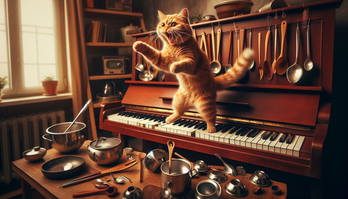 Теперь в квартире звучал настоящий “оркестр”: гул кастрюли, звон ложки и хаотичные аккорды пианино. Барсик скакал между инструментами, превращая комнату в концертный зал для себя одного.