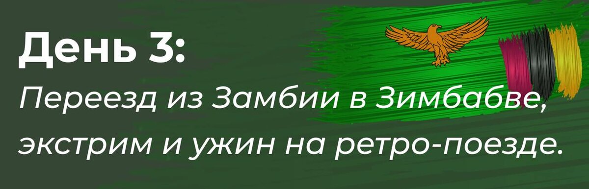 Третий день начался с переезда из Замбии в Зимбабве — новый штамп в паспорте, новый ритм, но дух приключений остался тот же 🇿🇼 После заселения нас ждал настоящий вызов: прыжок с 120 метров (высота 36 - этажного здания!) на качелях над ущельем Батока 😱 Дальше — зиплайн. Разбег, толчок, и вот ты несёшься над ущельем, ветер в лицо, скорость, которая выносит все мысли 💭 После такого экстрима нас ждал уютный ужин на ретро-поезде. По пути к нему мы проехали через саванну, где среди деревьев шагали слоны и паслись антилопы. Атмосфера старого фильма, мягкие кресла, официанты в белых перчатках, и неспешный ужин под стук колёс 🚂