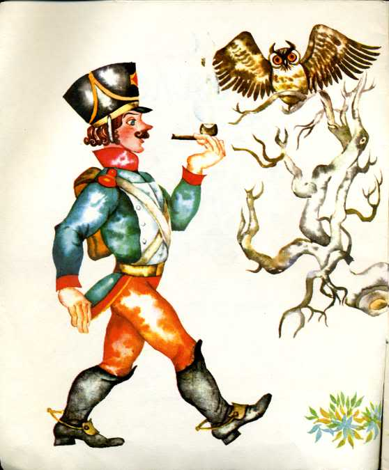 В глухую полночь является нечистый. «Здравствуй, служивый! Я опять к тебе погулять пришел». — «Здравствуй! Кто не рад веселому товарищу!» Начали пить-гулять. Нечистый увидал клещи и спрашивает: «А это что такое?» — «Да, вишь, король взял меня в свою службу да заставил музыкантов на скрипке учить; а у них у всех пальцы-то кривые — не лучше твоих, надо в клещах выправлять». — «Ах, братец, — стал просить нечистый, — нельзя ли и мне выправить пальцы? А то до сей поры не умею на скрипке играть». — «Отчего нельзя? Клади сюда пальцы». Черт вложил обе руки в клещи; солдат прижал их, стиснул, потом схватил прутья и давай его потчевать; бьет да приговаривает: «Вот тебе купечество!» Черт молит, черт просит: «Отпусти, пожалуй! За тридцать верст не подойду к дворцу!» А он знай бичует. Прыгал-прыгал черт, вертелся-вертелся, насилу вырвался и говорит солдату: «Хоть ты и женишься на королевне, а из моих рук не уйдешь! Только отъедешь за тридцать верст от города — сейчас захвачу тебя!» Сказал и исчез.
