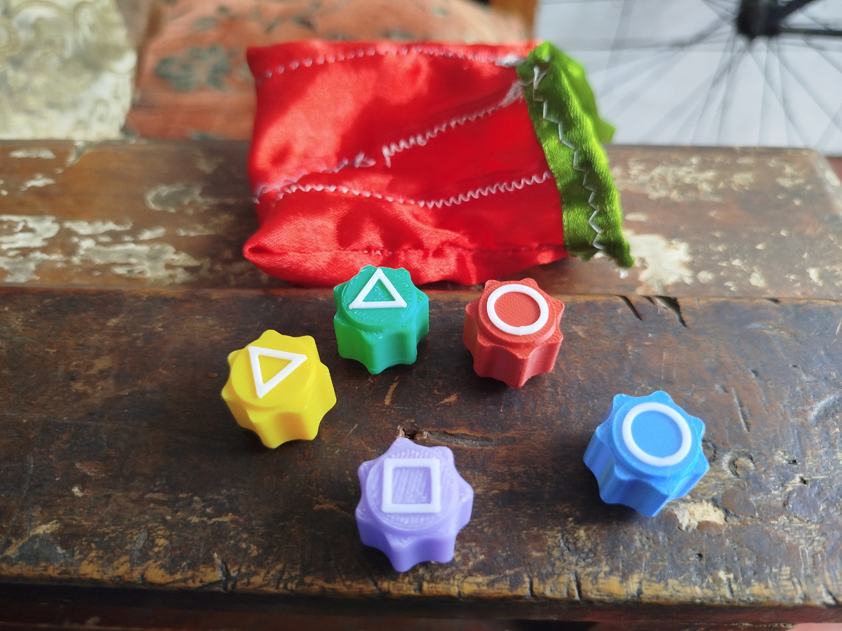Итак, понадобятся 5 одинакового размера небольших камушков, или ракушек, или небольших игральных кубиков, либо можно заказать в интернете специальные пластиковые фишки для игры в конгги Они могут быть различного дизайна, у меня вот как во втором сезоне сериала "Игра в кальмара". Муж в детстве играл ракушками, я же об этой игре узнала только из фильма в 41 годик. Сделала сначала фишки из пластилина, потом решила, что лучше купить, а то пластилин постоянно деформируется, и даже иногда фишки из него слипаются. В этой игре несколько раундов, распишу их подробно. Раунд первый. Высыпать фишки перед собой. Взять одну (я беру сиреневую, но можно любую), подбросить вверх, и пока она летает, взять любую другую фишку, затем поймать подброшенную той же рукой. И так все оставшиеся - бросаем вверх одну (ту же самую всегда, с которой начинали), берëм другую, в итоге в руке должны оказаться всё пять фишек. Если играть по упрощëнным правилам, то пойманные фишки можно перекладывать в другую руку,