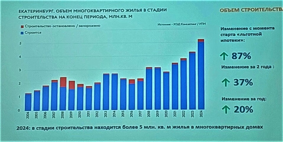 — С 2017 г. рынок новостроек рос в объемах почти без остановок. Небольшая инвестиционная пауза в начале 2020 г. была связана с появлением опасений, что спрос упадет, но она быстро завершилась. Была запущена льготная ипотека, стройка сильно выросла, и сейчас в Екатеринбурге возводится практически 5 млн кв. м в многоквартирниках.
