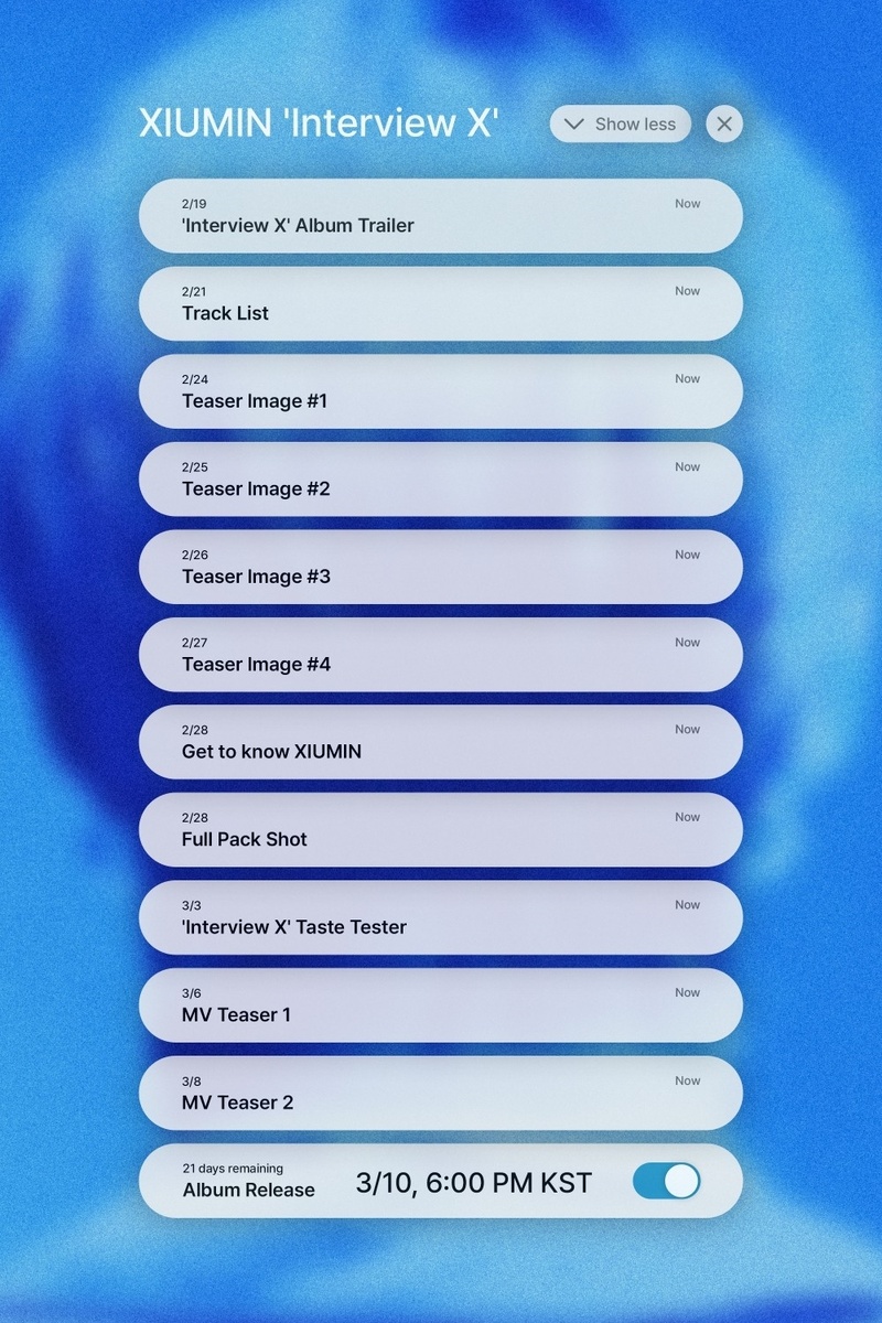 17 февраля на официальных страницах Шиумина (Xiumin) в социальных сетях была опубликована информация о его предстоящем музыкальном возвращении. Визуализация, выполненная в виде уведомления на экране телефона, раскрыла ключевые моменты, которые ожидают поклонников. Старт активной рекламной кампании нового мини-альбома "Интервью X" (Interview X) уже вскоре, и фанаты не скрывают своего нетерпения.