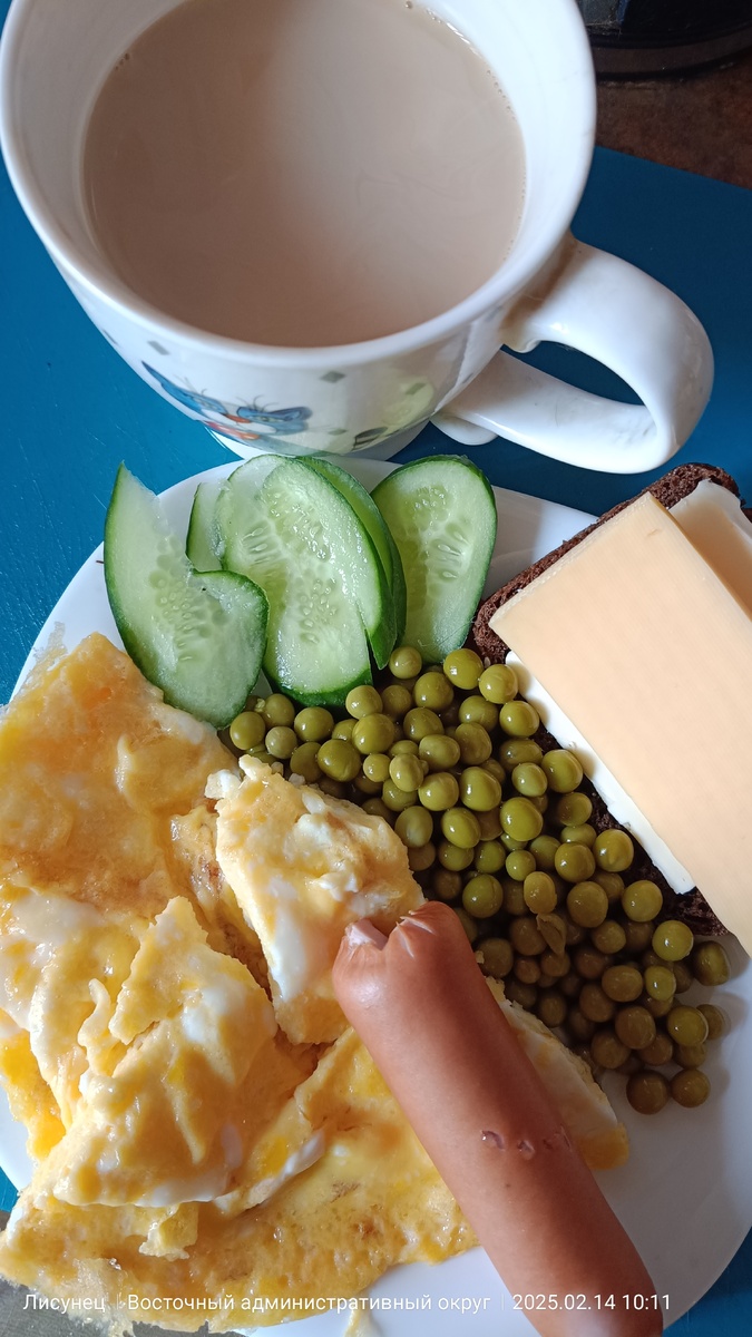 Омлет, сосиска, горошек,огурчик, бутик с сыром и цикорий с молоком и сахзамом.