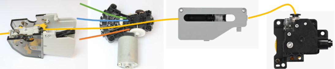 Левый и правый приводы подающего устройства управляют действиями подачи и выгрузки соответственно. Правый поднимает шестерню, чтобы вытянуть пруток для подачи, в то время как левый — чтобы привести в действие черный ролик для вращения катушки при выгрузке филамента, как показано ниже.