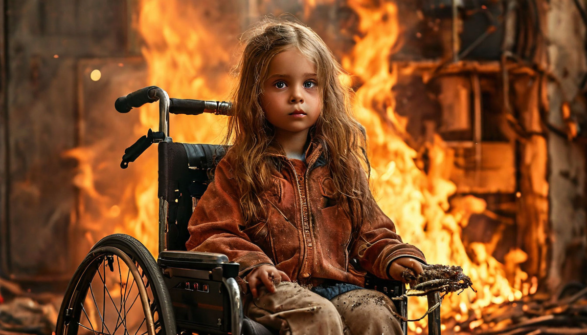 В этом хаосе выделялся пронзительный крик одной женщины, чьи руки судорожно хватались за воздух, словно пытаясь удержать исчезающую надежду. Её голос разрывал тишину, как острое лезвие, разя сердца тех, кто стоял рядом. Люди пытались сдержать её, но она яростно вырывалась, умоляя их позволить ей пройти. Там, внутри этого пылающего ада, оставалась её дочь — хрупкая душа, навечно заключённая в инвалидное кресло.