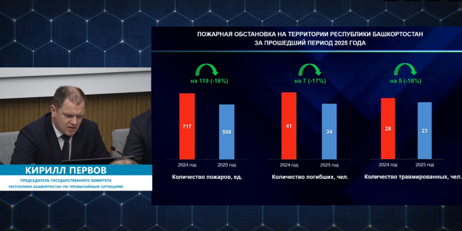 В Башкирии с начала года произошло 598 пожаров, сообщил на оперативном совещании в правительстве РБ председатель Госкомитета РБ по ЧС Кирилл Первов. Это на 16% меньше, чем за аналогичный период 2024 года. Также снизилось число погибших и пострадавших в пожарах. Погибло с начала года 34 человека (–17% или минус семь человек к 2024 г.). Пострадало 23 человека (–18% или минус пять человек к 2024 г.) Ранее мы сообщали о том, что в деревне Бузат Стерлибашевского района пожарный извещатель спас жизнь пенсионерки. Фото: ЦУР РБ.