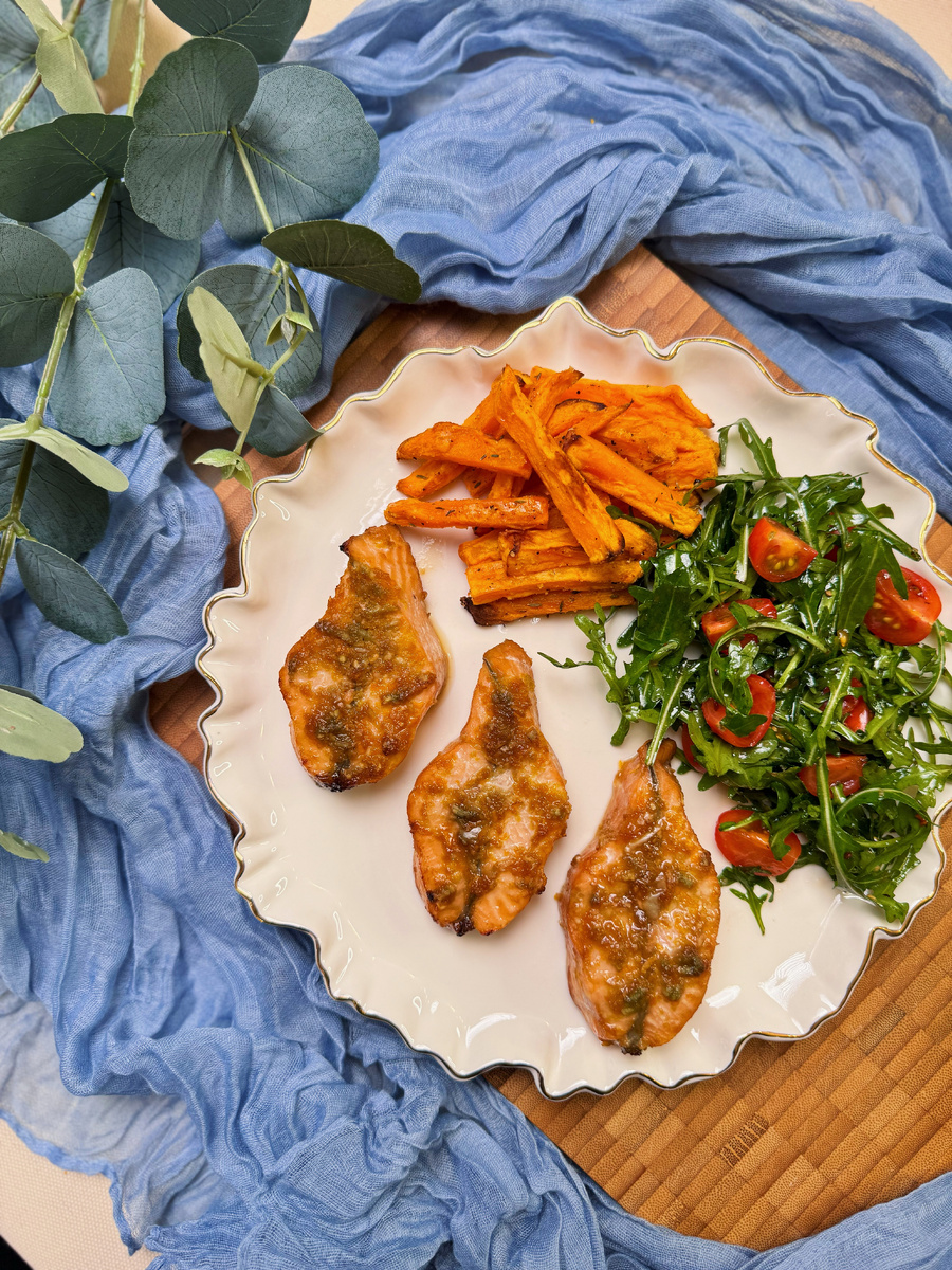 Перед весной и летом хочется легкой еды, чтобы скинуть лишние килограммы после зимних праздников. А кто-то просто любит питаться полезно. Я приготовила 7 полезных, но вкусных ужинов, которые отразятся на вашей фигуре лишь положительно! У каждого блюда приведены все граммовки, посчитаны калории, белки, жиры и углеводы. Ранее я уже выкладывала рецепты первого, второго, третьего, четвертого, пятого и шестого дней. День 7 Стейки форели в апельсиново-чесночном маринаде с бататом и салатом Нам понадобится (на 2 порции): ⁃ Форель 400г ⁃ Батат 300г ⁃ Соевый соус 4 ст.л. ⁃ Чеснок 2 зубчика ⁃ Апельсин 1 шт ⁃ Оливковое масло 2 ст.л. ⁃ Перец молотый 0.5 ч.л. ⁃ Соль 1 ч.л. ⁃ Сушеный чеснок 1 ч.л. ⁃ Рукола 30г ⁃ Черри 150г ⁃ Бальзамический соус 1.5 ч.л. ⁃ Тимьян пару веточек ⁃ Приправа для салата 0.5 ч.л. 1 порция: 667 калорий 1. Стейки форели кладем в глубокую миску, добавляем соевый соус, цедру 1 апельсина, сок половинки апельсина и чеснок. Если боитесь, что чеснока много, возьмите 1 дольку. Все п