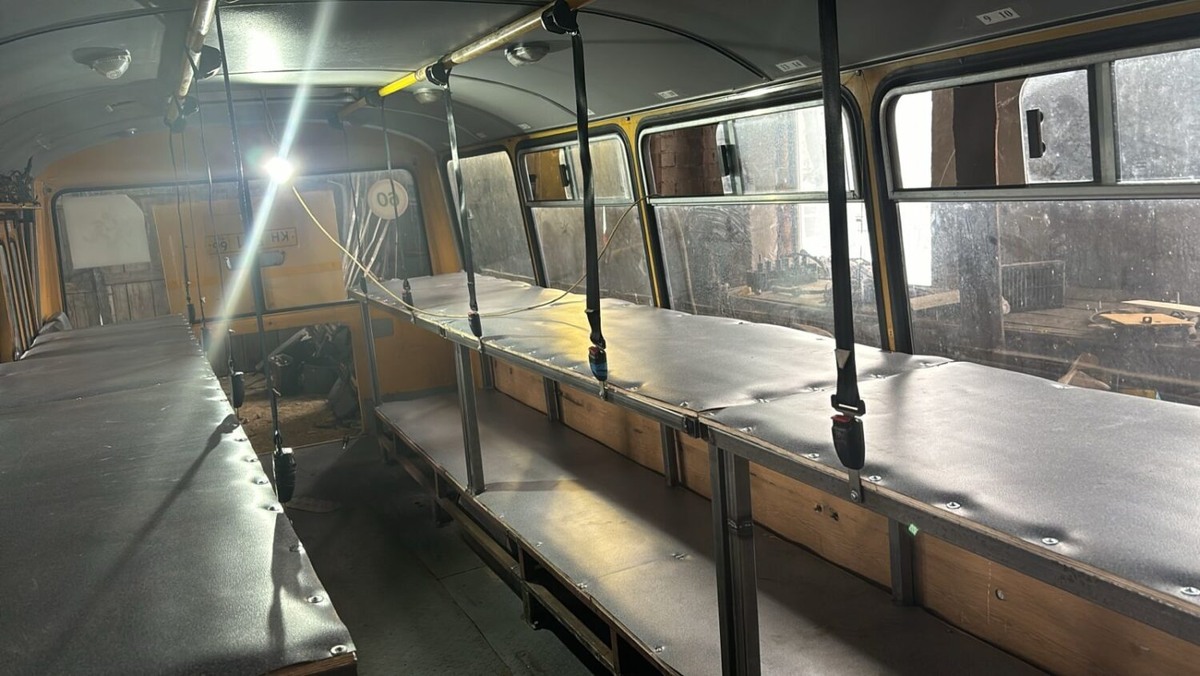 Сарсинские «кулибины» переделали списанный школьный автобус под реанимационный транспорт для вывоза раненых с передовой и дальнейшей их транспортировки в госпиталь.