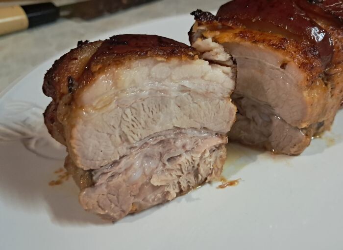 - ложка ссоли Грудинку надрезаем с той стороны, где была кожа. Разрезы делаем глубокие, туда потом будем вставлять кусочки ябока Натираем маринадом и убираем в холодильник мариноваться часов на 5 минимум (до суток) Когда грудинка промариновалась, достаем яблочко, нарезаем его довольно толстыми клиновидными ломтиками Вставляем ломтики яблока в разрезы на грудинке Запекаем грудинку 1,5 часа при температуре 150 градусов. Минут за 10 можно температуру увеличить, чтобы появилась зажарочка Это очень вкусно как в горячем виде, так и в холодном )