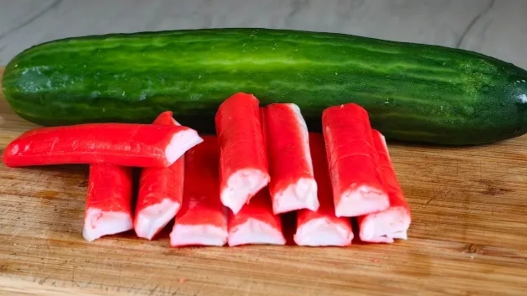 Ингредиенты крабовые палочки - 200 грамм лимонный сок - 1 столовая ложка вареные яйца - 5 штук свежий огурец - 1 штука лук - 1 штука (средняя ) сахар - 1 чайная ложка соль - 0.5 чайной ложки яблочный уксус 6% - 1 столовая ложка залить лук теплой водой плавленный сыр - 2 штуки майонез - 80-100 грамм Приготовим салат 200 грамм крабовых палочек натираем на крупной тёрке и пересыпаем в миску, выдавливаем примерно 1 столовую ложку лимонного сока, перемешиваем и оставляем в сторонку. 5 варёных яиц отделяем белок от желтка, белки натираем на крупной тёрке и приступаем к сборке салата. Для сборки салата я использую разъёмное кольцо. Выкладываем белки в разъёмное кольцо и распределяем по дну тарелки. Сверху делаем сетку из майонеза, высыпаем крабовые палочки и распределяем по всей поверхности. Так же заправляем майонезом и убираем в сторонку. 1 свежий огурец сначала нарезаем кольцами , а потом соломкой. Всыпаем сверху на салат и распределяем. Мелко измельчаем 1 среднюю луковицу , п