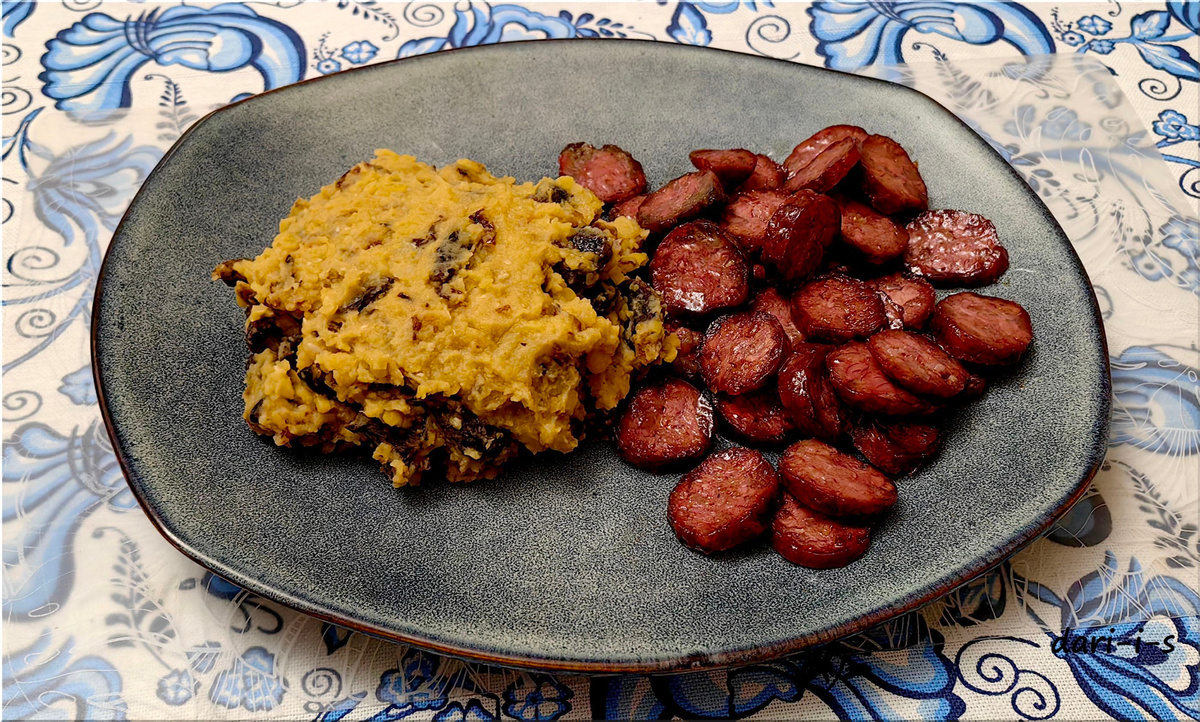 Продолжаю готовить по полюбившейся мне книге "Русская кухня. Главное за 500 лет" Влада Пискунова - шеф-повара московского ресторана "Матрёшка" (Maison Dellos), занимающегося изучением и популяризацией русской кухни. Горох - гарнир известный, но добавив в гороховое пюре лук и грибы, можно получить очень вкусное блюдо. А слегка поджаренные сыровяленые или копчёные колбаски отлично дополняют его. Просто, сытно, вкусно. Нам потребуются: Грибы (если они сушёные) и горох замачиваем на ночь. Горох отвариваем до готовности, даже чуть больше, чтобы он хорошо разварился. В конце немного солим. Сливаем лишнюю воду и толчём обычной толкушкой для картофеля. Лук мелко режем. Чеснок рубим мелко, а грибы - крупно. Колбаски нарезаем кружочками. Обжариваем лук на растительном масле до полной готовности (я зажариваю аж до лёгкой "коричневинки"). Грибы можно немного отварить перед обжаркой для мягкости, но я так не делаю. Грибы отдельно обжариваем на растительном масле до готовности вместе с чесноком