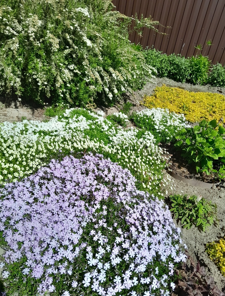 Это самый важный фактор - лишить траву места роста. В чистый прополотый грунт - без корней травы - высажены ползучие многолетники. Вот - очень красивые флоксы шиловидные. Цветут в апреле-мае и августе-сентябре.
