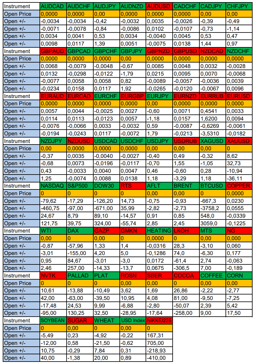 Весь перечень анализируемых активов указан ниже в общем количестве 61 инструмента. Здесь Вы найдете активы рынка Форекс, популярные активы Московской биржи, не менее популярные активы Чикагской биржи СМЕ и мажор криптовалютного сегмента - Биткоин, за которым следуют все альткоины.