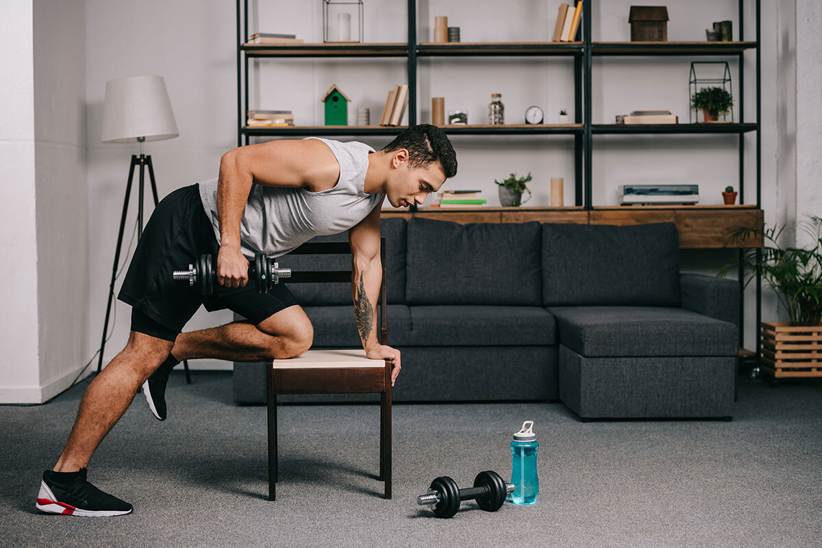 В первое время можно заниматься с собственным весом или использовать то, что есть под рукой: стулья, бутылки с водой и песком.