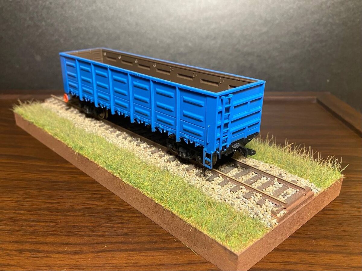 Тем временем вагон был собран, загрунтован, окрашен. Специально для него была изготовлена подставка из МДФ в виде модели участка пути (рельсы, балластная призма, грунт, трава). С учетом неспешной работы, просушки слоев грунта, краски и лаков, а также краски и клея на подставке на все ушла примерно неделя.