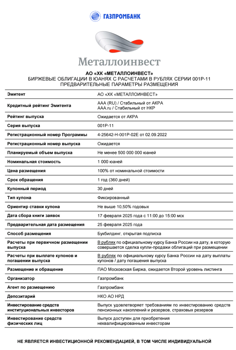 ⏰ Утро доброе, уважаемые читатели! Надеюсь, ваши выходные принесли достаточное количество приятных эмоций :) Биржа не спешит нагружать нас в первый рабочий день недели, на повестке лишь единственный диковинный выпуск, по которому до обеда пройдёт сбор заявок: 🟢 ХК МЕТАЛЛОИНВЕСТ 001Р-11 📊 🅰️🅰️🅰️ 🧧 Выпуск в юанях с расчетами в рублях ✉️ Ориентир купона: не выше 10,5% ❌ CALL/PUT отсутствуют 🔸 Погашение через год 🔸 Начало торгов: 25.02.2025 ☃️ Не моя специализация - понятия не имею, что делать в коротком юаневом выпуске :) Но, наверное, сегодняшний курс дает неплохой момент входа. Проблема в том, что расчеты по первичке пройдут по курсу в день размещения, а какой он будет через неделю, интрига... Так что учтите и этот момент) Успешного старта недели, пусть она будет прибыльной и спокойной! #облигации #новые_размещения