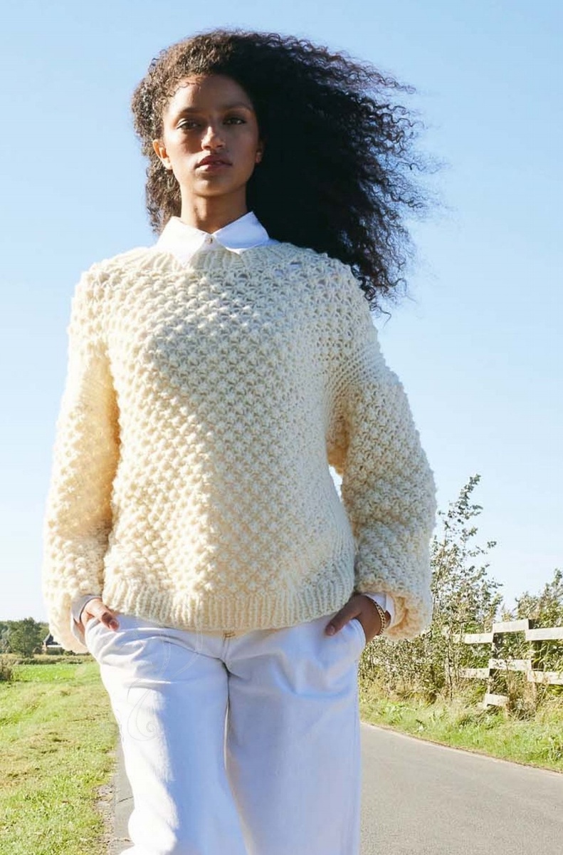 Джемпер с шишечками связан на толстых спицах из неотбеленной пряжи, состоящей из шерсти и хлопка. Он свободно сидит на фигуре благодаря прямому силуэту и пышным рукавам. Узор с шишечками» создает красивую объемную структуру полотна. Это изделие - просто мечта!
