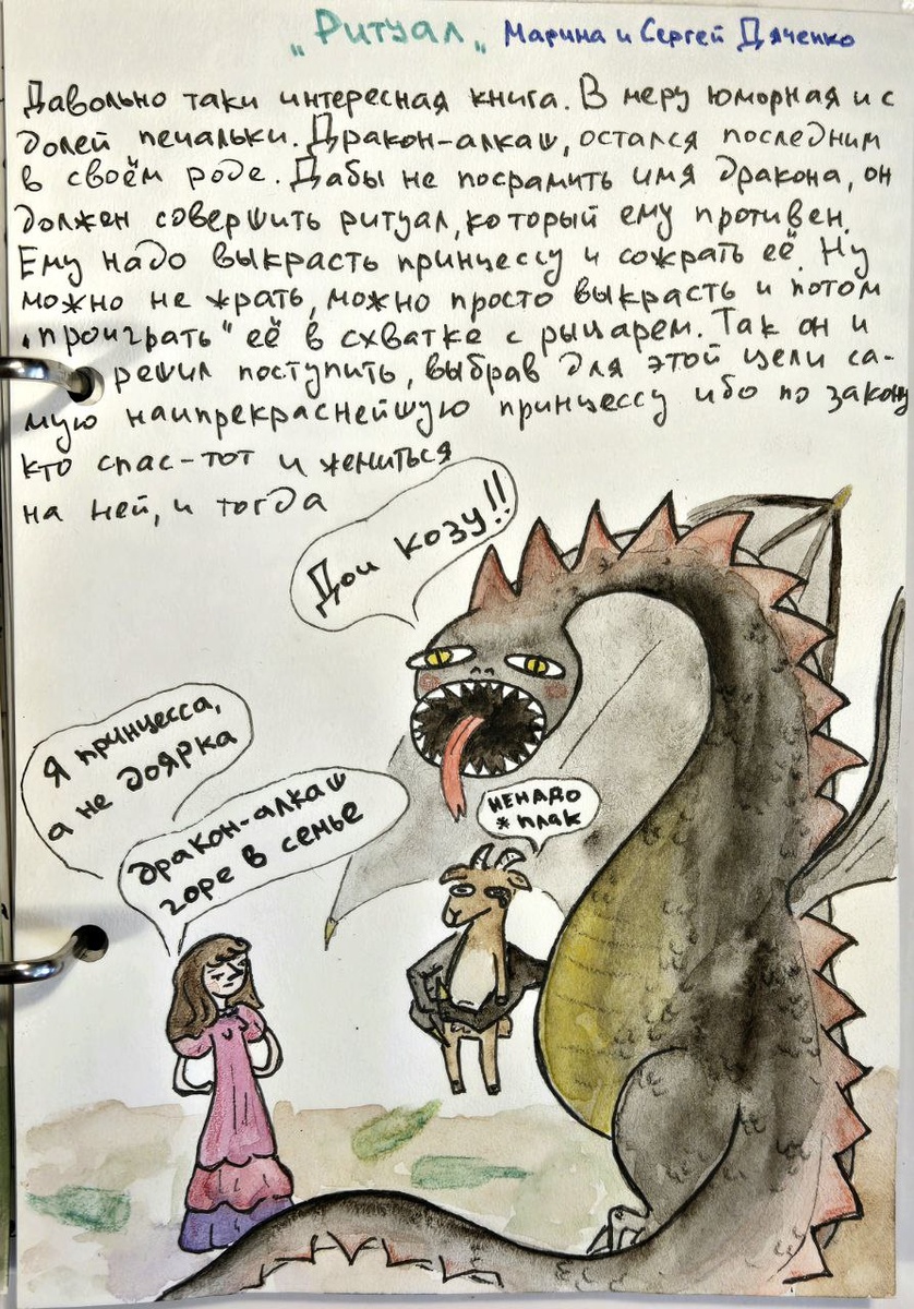 Довольно-таки интересная книга. В меру юморная и с долей печельки. Дракон-алкаш, остался последним в своём роде. Дабы не посрамить имя дракона, он должен совершить ритуал, который ему противен. Ему надо выкрасть принцессу и сожрать её. Ну можно не жрать, можно просто выкрасть и потом «проиграть» её в схватке с рыцарем. Так он и решил поступить, выбрав для этой цели самую наипрекраснейшую принцессу ибо по закону, кто спас-тот и жениться на ней, и тогда сразу каааак набегут, кааак спасут. И быстро и ритуал совершен. Но бухой дракон — горе в семье и он слегка облажался. Выкрал не ту что запланировал, а её страшную старшую сестру, что такая страшнющая и вреднохарактерная, что все её недолюбливают. Ну и конечно же никто её спасать не захотел, а то ещё заставят жениться. Так и пришлось дракону огребать от неё самому. Но по ходу дела они очень даже поладили. Вроде уже и принцесса не такая уж и страшная, да и дракон не такой уж и злой. И вот, почти уже и любовь, но тут дракон осознал, что не с