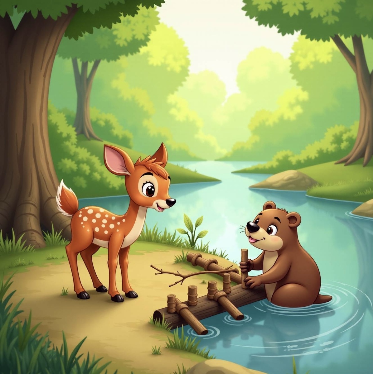 В одном живописном уголке леса жил бобр по имени Боря. Он был трудолюбивым и целеустремленным строителем, который мечтал соорудить самую крепкую и красивую плотину на реке. Каждый день Бори трудился над своей постройкой, но река была широкой, а течение сильным, поэтому работа продвигалась медленно. Однажды утром, когда Боря собирался приступить к работе, он заметил маленького оленя, стоящего на берегу реки. Лосенок выглядел растерянным и грустным. — Привет, дружок! Что случилось? — спросил Боря. Оленёнок поднял голову и ответил: — Меня зовут Кай. Я заблудился и не могу найти дорогу домой. Моя мама ушла искать еду, а я остался ждать её здесь, но теперь я не знаю, куда идти. Боря задумался. Он понимал, насколько важно для Кая вернуться к маме, но знал, что ему самому нужно продолжать строить плотину. И тут у него появилась идея! — Знаешь что, Кай? Давай я помогу тебе найти маму, если ты поможешь мне с плотиной. Вместе мы справимся быстрее, и твоя мама будет рада видеть тебя снова. Ка