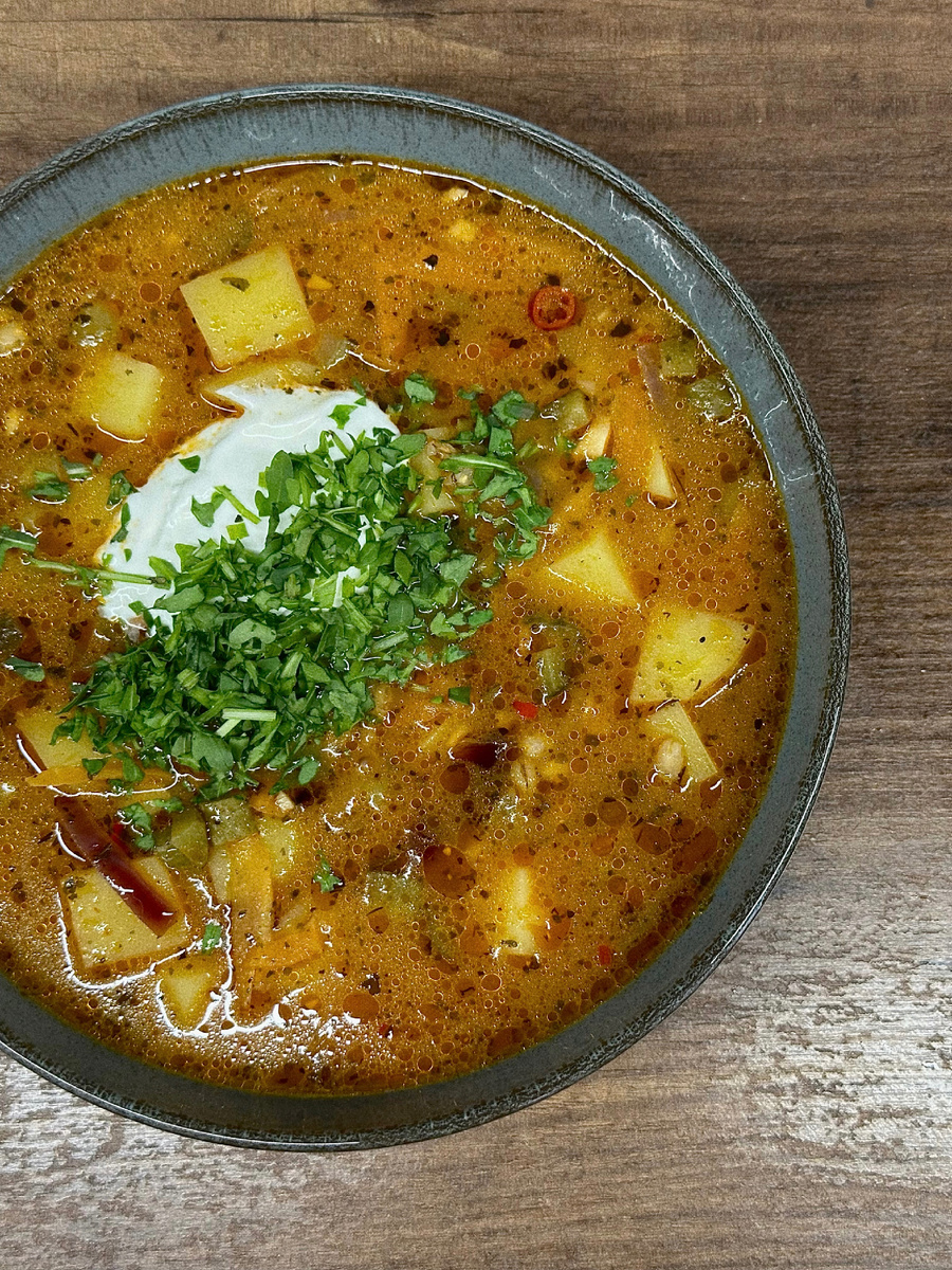Что нам нужно: - вода (бульон) - корнишоны (и рассол) - перловка - для зажарки: лук репчатый, морковь, чеснок (зубчик) - томатная паста - картофель - соль/перец/специи - масло сливочное/растительное - перчик чили (по желанию) Что мы с этим делаем: сначала зажарка - лук режем полукольцами, морковку натираем на крупной терке, чеснок мелко рубим и всё это обжариваем на масле (растительное + сливочное), солим/перчим/добавляем специи по вкусу и рубленый перчик чили. Туда же закидываем нарезанные кубиком корнишоны и перловку, еще немного обжариваем и добавляем рассол, перемешиваем, туда же добавляем томатную пасту (1-2 ст.л), заливаем бульоном или водой (добавляем кубик маги) и варим до полуготовности перловки. После добавляем картошку нарезанную кубиком и варим до полной готовности. Собственно, всё! Наливаем в тарелку, добавляем сметану и зелень иии наслаждаемся! Приятного аппетита! 🫶🏻